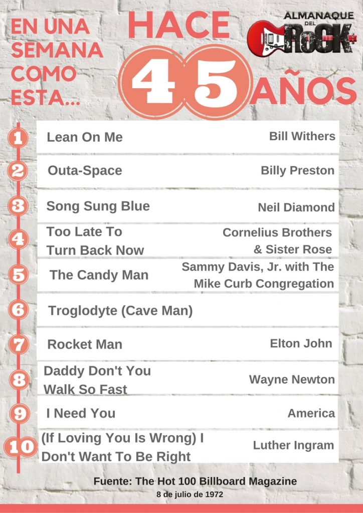 Y en la # 1 llega un gran tema compuesto e interpretado por Bill Withers. Se trata de ‘Lean on Me‘. Este sería el primer sencillo de su segundo álbum ‘Still Bill‘ y se convertiría en el primer tema en tono Soul en llegar a este sitio en la historia de la música y catalogada como la # 205 dentro de las 500 mejores de la Revista Rolling Stone. Ve aquí el VIDEO de ‘Lean on Me’