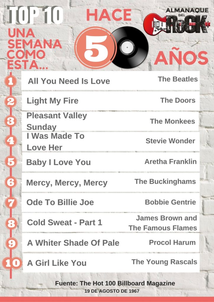 Lanzado como sencillo, ‘I Was Made to Love Her’ alcanzó el puesto #2 en esta lista. Para esta semana de agosto ya venía en descenso y el #1 le sería negado en su momento nada menos que por la presencia de ‘Light My Fire’ de Los Doors, que no soltaron el hueso en 3 semanas. Cabe destacar que en una entrevista en 1968, Wonder aseguró que ‘I Was Made To Love Her’ era su tema favorito ‘porque es una canción verdadera’. Y la verdad es que reúne la esencia de este enorme artista, especialmente el maravilloso solo de armónica en la introducción.