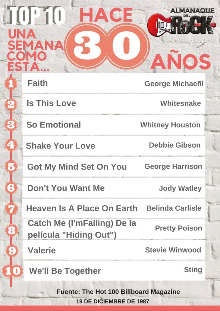 La lista del Top Ten Billboard muestra una mezcla muy característica de la época, se funden temas de rock muy comercial, junto con algunas baladas, bastante Dance, además de la llegada de algunos de los creativos musicales de las grandes bandas del Rock Clásico. Un poco de todo. Aquí la lista de los 10 primeros según Billboard, en la tercera semana de diciembre de 1987, hace 30 años.