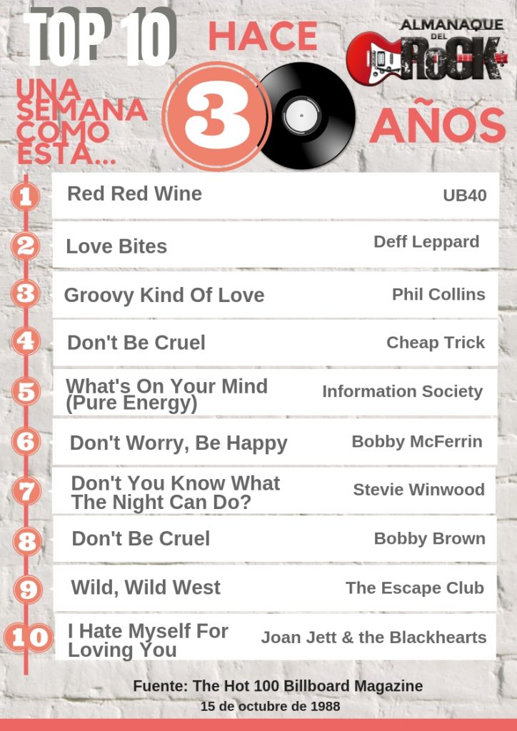 El Top Ten del 15 de octubre de 1988, presentaba en el #2 “Love Bites”, una poderosa balada que ya venía de regreso, después de ubicarse durante una semana en el #1, único tema de Def Leppard que alcanzó esta posición en el Hot 100
